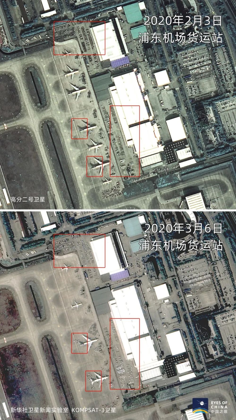 浦東機(jī)場貨運(yùn)站,2月3日多架停放在地面的飛機(jī)裝卸貨物跡象不明顯。3月6日,地面停放飛機(jī)數(shù)量減少,且多在進(jìn)行裝卸作業(yè),堆放的貨物也大大增多。