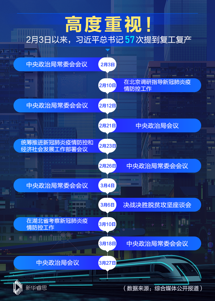 數(shù)據(jù)顯示,自2月3日以來,習(xí)近平在不同場合共提到了復(fù)工復(fù)產(chǎn)57次,足見總書記對復(fù)工復(fù)產(chǎn)工作的重視和關(guān)注。