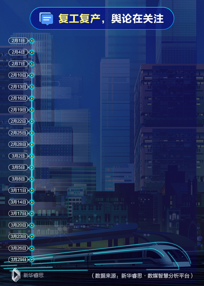 對網(wǎng)上“復(fù)工復(fù)產(chǎn)”相關(guān)話題的信息量和關(guān)注熱度,新華睿思持續(xù)跟蹤,自2月初至3月28日統(tǒng)計總量已達(dá)2784萬條,網(wǎng)民的關(guān)注度不斷攀升。