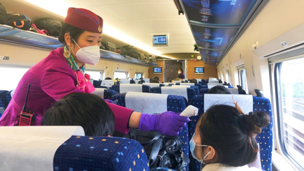 4、測溫:專列內(nèi)幾乎滿座,餐飲等服務(wù)照常進(jìn)行,乘務(wù)員定時為乘客測量體溫。
