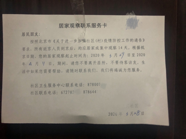 8、交接:車輛到達(dá)社區(qū)后,隨行的街道干部同社區(qū)工作人員進(jìn)行交接。返京人員在測量體溫、簽署《居家觀察個人告知書》等文件后,由社區(qū)工作人員送至家中。居家觀察的14天內(nèi),將嚴(yán)格禁止外出、會客等行為,由社區(qū)安排專人幫助解決生活困難。