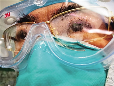 四層手套、三層防護服、口罩、防護鏡、面罩、正壓頭套……因為穿戴特殊防護設備,平常一臺5至10分鐘的手術,現(xiàn)在要用3倍的時間來完成。