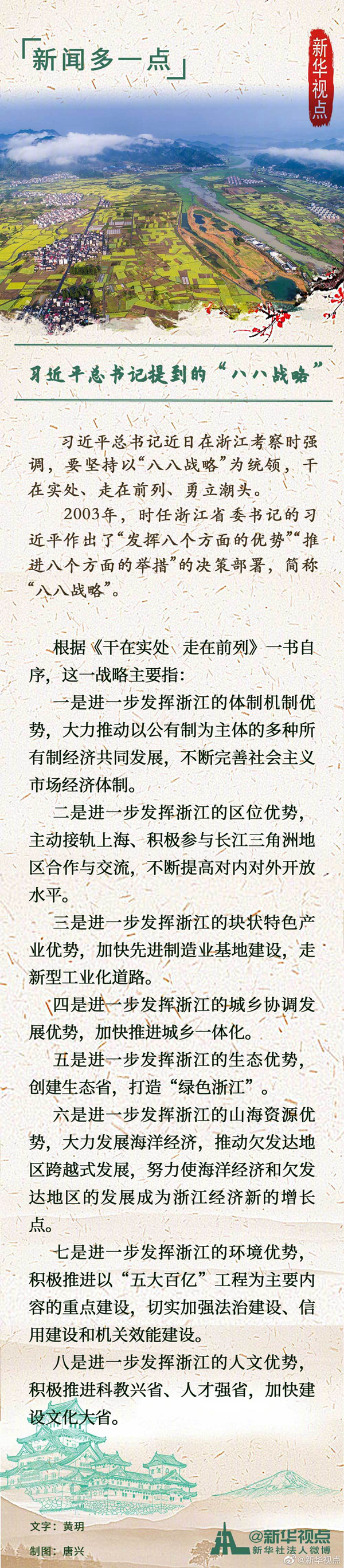 2003年,時任浙江省委書記的習近平作出了“發(fā)揮八個方面的優(yōu)勢”“推進八個方面的舉措”的決策部署,簡稱“八八戰(zhàn)略”。