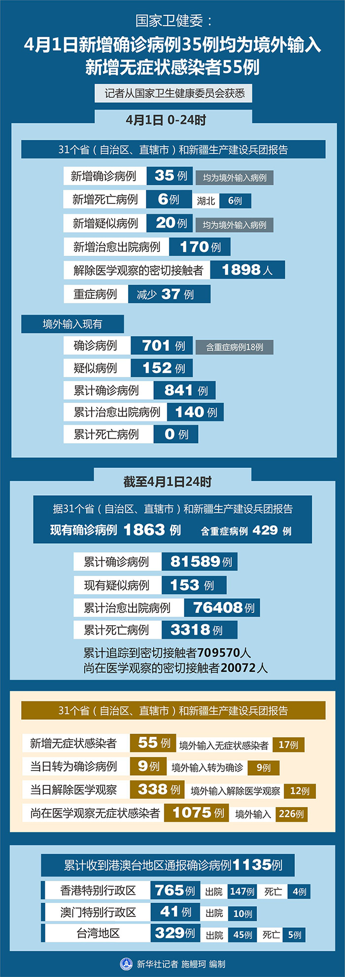 截至4月1日24時,據(jù)31個?。ㄗ灾螀^(qū)、直轄市)和新疆生產建設兵團報告,現(xiàn)有確診病例1863例(含重癥病例429例),現(xiàn)有疑似病例153例。累計確診病例81589例,累計治愈出院病例76408例,累計死亡病例3318例,累計追蹤到密切接觸者709570人,尚在醫(yī)學觀察的密切接觸者20072人。