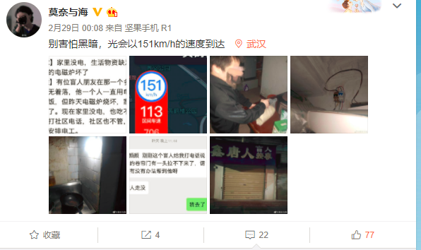 2月28日晚上10點(diǎn)多,樓威辰收到一項(xiàng)特殊的求助。一個(gè)獨(dú)居盲人張磊(化名)因電磁爐燒壞導(dǎo)致跳閘停電,無(wú)法做飯,打電話給社區(qū),社區(qū)說(shuō)暫時(shí)沒(méi)法安排電工,只好通過(guò)朋友在網(wǎng)上求助。