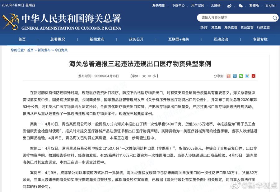 醫(yī)療物資違法違規(guī)出口?海關從嚴從重從速處罰!-新華網(wǎng)