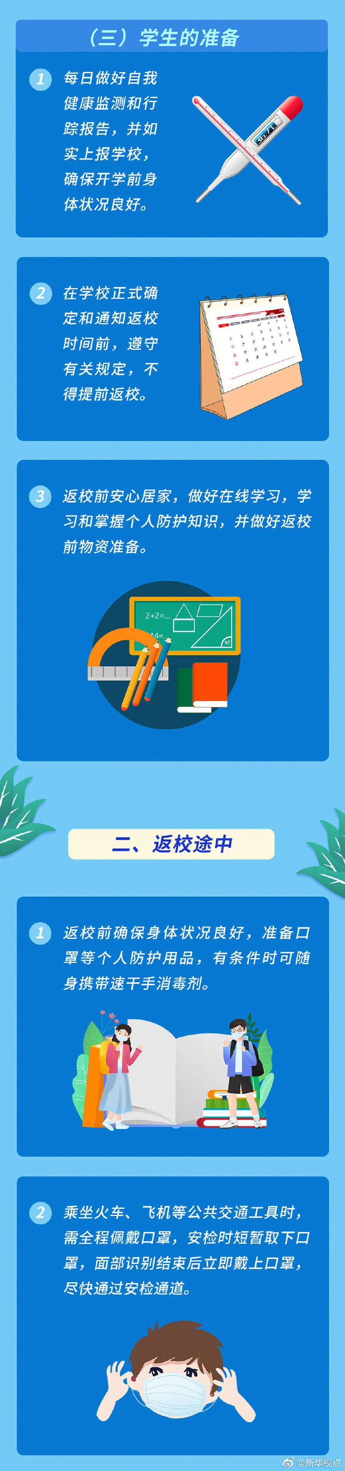 返校途中如何正確防護(hù)?開學(xué)后上課、用餐又該注意啥?周末還能出校改善伙食嗎?國(guó)家衛(wèi)健委、教育部日前聯(lián)合印發(fā)《大專院校新冠肺炎疫情防控技術(shù)方案》,馬上開學(xué)的你,快收下這份防控寶典↓(圖片來(lái)源:健康中國(guó))(記者溫競(jìng)?cè)A) ?????