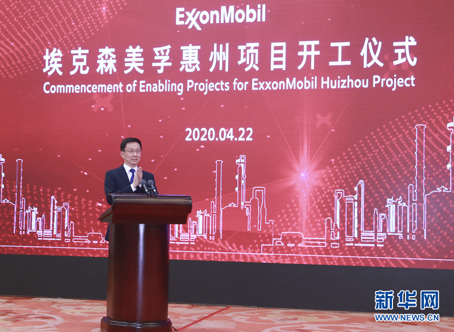 當(dāng)日上午,韓正在北京人民大會(huì)堂,中共中央政治局委員、廣東省委書記李希在廣東惠州會(huì)場(chǎng),??松梨诠径麻L(zhǎng)兼首席執(zhí)行官伍德倫在美國(guó)達(dá)拉斯市會(huì)場(chǎng),通過(guò)視頻連線的形式在“兩國(guó)三地”共同出席項(xiàng)目開工儀式。開工儀式上播放了項(xiàng)目介紹視頻,??松梨诠?、廣東省、國(guó)家發(fā)展和改革委員會(huì)有關(guān)負(fù)責(zé)人分別在三地會(huì)場(chǎng)致辭。11時(shí)許,韓正宣布??松梨趶V東惠州乙烯項(xiàng)目開工,項(xiàng)目建設(shè)正式拉開帷幕。
