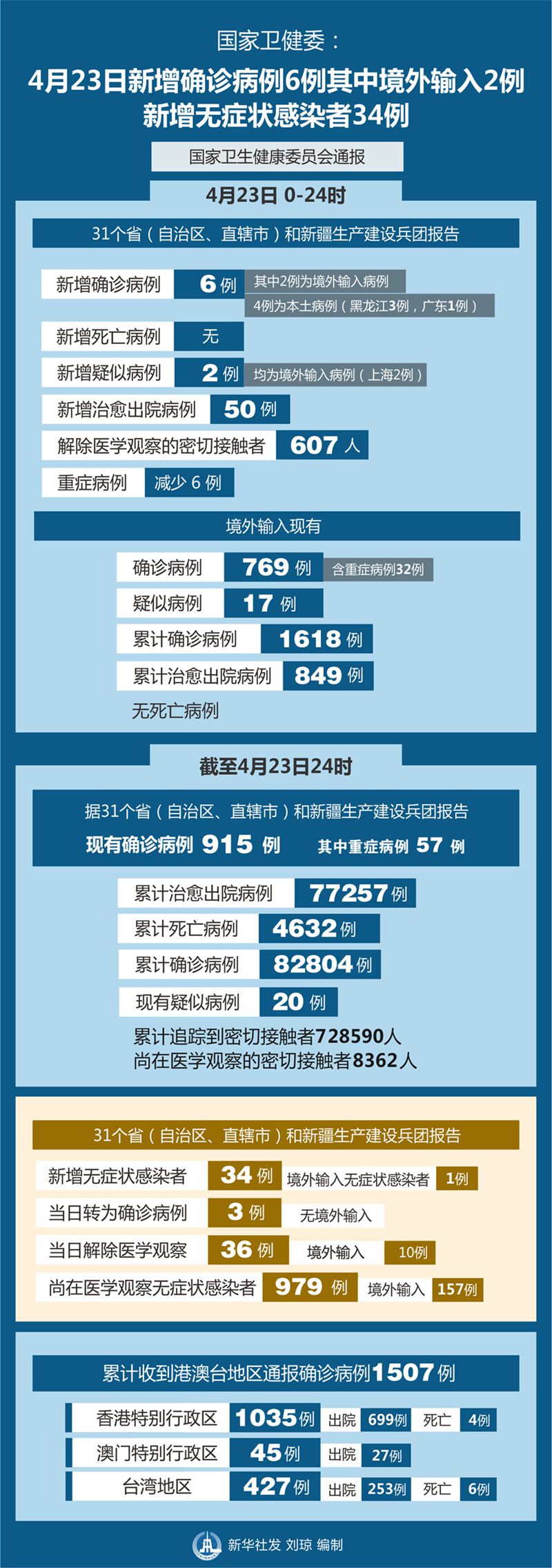 截至4月23日24時,據(jù)31個?。ㄗ灾螀^(qū)、直轄市)和新疆生產(chǎn)建設兵團報告,現(xiàn)有確診病例915例(其中重癥病例57例),累計治愈出院病例77257例,累計死亡病例4632例,累計報告確診病例82804例,現(xiàn)有疑似病例20例。累計追蹤到密切接觸者728590人,尚在醫(yī)學觀察的密切接觸者8362人。