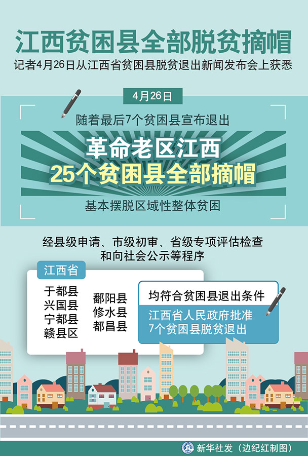 新華社南昌4月26日電(記者陳毓珊)26日,隨著最后7個貧困縣宣布退出,革命老區(qū)江西25個貧困縣全部摘帽,基本擺脫區(qū)域性整體貧困。