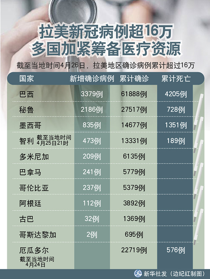 新華社墨西哥城4月26日電 綜合新華社駐拉美地區(qū)記者報道:新冠疫情在拉美多國持續(xù)蔓延。截至當(dāng)?shù)貢r間26日,拉美地區(qū)確診病例累計超過16萬。多國政府為應(yīng)對疫情,加緊籌備醫(yī)療物資,增派醫(yī)療人員。