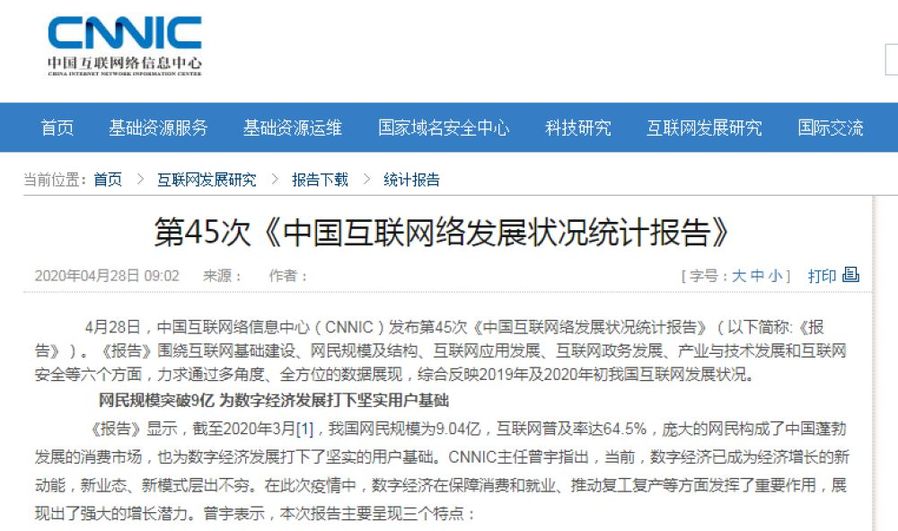 4月28日,中國(guó)互聯(lián)網(wǎng)絡(luò)信息中心(CNNIC)發(fā)布第45次《中國(guó)互聯(lián)網(wǎng)絡(luò)發(fā)展?fàn)顩r統(tǒng)計(jì)報(bào)告》(以下簡(jiǎn)稱:《報(bào)告》)?!秷?bào)告》圍繞互聯(lián)網(wǎng)基礎(chǔ)建設(shè)、網(wǎng)民規(guī)模及結(jié)構(gòu)、互聯(lián)網(wǎng)應(yīng)用發(fā)展、互聯(lián)網(wǎng)政務(wù)發(fā)展、產(chǎn)業(yè)與技術(shù)發(fā)展和互聯(lián)網(wǎng)安全等六個(gè)方面,力求通過(guò)多角度、全方位的數(shù)據(jù)展現(xiàn),綜合反映2019年及2020年初我國(guó)互聯(lián)網(wǎng)發(fā)展?fàn)顩r。