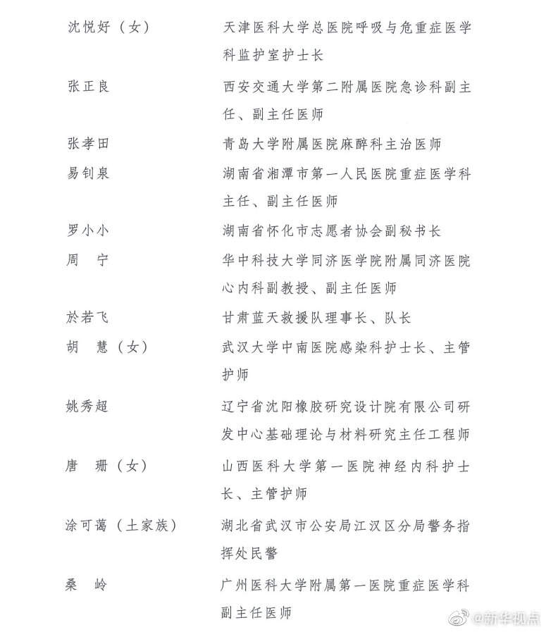 榮獲第24屆“中國青年五四獎?wù)隆钡姆謩e是:江蘇省南京市鼓樓區(qū)方家營消防救援站站長助理、三級消防長丁良浩,安徽省滁州市定遠(yuǎn)縣吳圩鎮(zhèn)西孔村黨總支第一書記王萌萌(女),廈門大學(xué)航空航天學(xué)院常務(wù)副院長、特聘教授、博士生導(dǎo)師尤延鋮,湖北省黃岡市羅田縣希望小學(xué)校長方榮(女),浙江每日互動網(wǎng)絡(luò)科技股份有限公司董事長兼總經(jīng)理、黨委書記方毅,浙江省杭州市拱墅區(qū)職業(yè)高級中學(xué)美發(fā)專業(yè)教師石丹(女),國家超級計(jì)算無錫中心副主任付昊桓,中國石油大港油田公司第二采油廠作業(yè)二區(qū)注采二組副組長馮萌萌(女),寧夏回族自治區(qū)石嘴山市中醫(yī)醫(yī)院副主任醫(yī)師朱斌,中國國家女子排球隊(duì)隊(duì)員、隊(duì)長朱婷(女),95072部隊(duì)參謀部訓(xùn)練處正團(tuán)職飛行技術(shù)檢查主任劉飛,廣西壯族自治區(qū)玉林市博白縣桂源農(nóng)牧有限公司總經(jīng)理劉入源,貴州省黔西南州望謨縣實(shí)驗(yàn)高中黨總支副書記、副校長劉秀祥,哈爾濱工業(yè)大學(xué)體育部副教授張虹(女),遼寧省沈陽造幣有限公司鉗工高級技師、維修班班長張文良(滿族),北京市朝陽區(qū)青少年指導(dǎo)服務(wù)中心主任張曉菲(女),吉林省超凡夢想公益基金會理事長張超凡(女),中國科學(xué)院計(jì)算技術(shù)研究所所長助理、研究員、博士生導(dǎo)師陳云霽,武警部隊(duì)某部特戰(zhàn)訓(xùn)練大隊(duì)代理大隊(duì)長陳玉浩,中山大學(xué)中山眼科中心副主任、研究員林浩添,四川省廣元市青川縣恒豐食用菌種植專業(yè)合作社理事長、青川海伶山珍商貿(mào)有限責(zé)任公司總經(jīng)理趙海伶(女),航空工業(yè)哈爾濱飛機(jī)工業(yè)集團(tuán)有限公司數(shù)控銑工秦世俊,92950部隊(duì)飛行一大隊(duì)大隊(duì)長袁偉,中鐵二局磨萬鐵路第Ⅵ標(biāo)項(xiàng)目經(jīng)理部第一分部二工區(qū)工區(qū)長、高級工程師徐州,博奧賽斯(天津)生物科技有限公司董事長欒大偉,港珠澳大橋管理局副總工程師、教授級高級工程師景強(qiáng),湖北省咸寧市崇陽縣白霓鎮(zhèn)大市村黨支部書記程桔(女),山東省七兵堂集團(tuán)股份有限公司董事長、黨支部書記謝清森,江蘇蘇寧物流有限公司快遞員潘虎,南京大學(xué)醫(yī)學(xué)院附屬鼓樓醫(yī)院腫瘤科行政副主任、南京大學(xué)臨床腫瘤學(xué)研究所副所長、博士生導(dǎo)師魏嘉(女),中國醫(yī)科大學(xué)附屬第一醫(yī)院重癥醫(yī)學(xué)科黨支部書記、副主任,教授、主任醫(yī)師丁仁彧,內(nèi)蒙古自治區(qū)第四醫(yī)院護(hù)士長、副主任護(hù)師王穎麗(女、蒙古族),四川省醫(yī)學(xué)科學(xué)院·四川省人民醫(yī)院EICU副主任醫(yī)師鄧?yán)冢憬『贾菔兄嗅t(yī)院重癥監(jiān)護(hù)室副護(hù)士長朱佳清(女),江蘇康為世紀(jì)生物科技有限公司總經(jīng)理、黨支部書記莊志華(女),首都醫(yī)科大學(xué)附屬北京友誼醫(yī)院重癥醫(yī)學(xué)科主任助理、副主任醫(yī)師劉壯,中建深圳裝飾有限公司項(xiàng)目經(jīng)理劉鋮,重慶醫(yī)科大學(xué)附屬第一醫(yī)院呼吸與危重癥醫(yī)學(xué)科副主任醫(yī)師、副教授劉煜亮,青海省人民醫(yī)院重癥醫(yī)學(xué)科護(hù)士長、主管護(hù)師孫曉林(女),湖北省武漢市漢陽區(qū)龍陽街芳草社區(qū)黨支部書記、居委會主任杜云(女),福建省疾病預(yù)防控制中心免疫規(guī)劃所主管技師李東,中國鐵路南昌局集團(tuán)有限公司南昌疾病預(yù)防控制所消殺科科長楊波,河北中醫(yī)學(xué)院第一附屬醫(yī)院(河北省中醫(yī)院)護(hù)師肖思孟(女、滿族),北京協(xié)和醫(yī)學(xué)院教授、中國醫(yī)學(xué)科學(xué)院腫瘤醫(yī)院研究員吳晨(女),中國寶武武漢武鋼綠色城市技術(shù)發(fā)展有限公司海綿公司工程技術(shù)部部長何航,湖北順豐速運(yùn)有限公司分部經(jīng)理汪勇,天津醫(yī)科大學(xué)總醫(yī)院呼吸與危重癥醫(yī)學(xué)科監(jiān)護(hù)室護(hù)士長沈悅好(女),西安交通大學(xué)第二附屬醫(yī)院急診科副主任、副主任醫(yī)師張正良,青島大學(xué)附屬醫(yī)院麻醉科主治醫(yī)師張孝田,湖南省湘潭市第一人民醫(yī)院重癥醫(yī)學(xué)科主任、副主任醫(yī)師易釗泉,湖南省懷化市志愿者協(xié)會副秘書長羅小小,華中科技大學(xué)同濟(jì)醫(yī)學(xué)院附屬同濟(jì)醫(yī)院心內(nèi)科副教授、副主任醫(yī)師周寧,甘肅藍(lán)天救援隊(duì)理事長、隊(duì)長於若飛,武漢大學(xué)中南醫(yī)院感染科護(hù)士長、主管護(hù)師胡慧(女),遼寧省沈陽橡膠研究設(shè)計(jì)院有限公司研發(fā)中心基礎(chǔ)理論與材料研究主任工程師姚秀超,山西醫(yī)科大學(xué)第一醫(yī)院神經(jīng)內(nèi)科護(hù)士長、主管護(hù)師唐珊(女),湖北省武漢市公安局江漢區(qū)分局警務(wù)指揮處民警涂可藹(土家族),廣州醫(yī)科大學(xué)附屬第一醫(yī)院重癥醫(yī)學(xué)科副主任醫(yī)師桑嶺,湖北省武漢市第三醫(yī)院重癥醫(yī)學(xué)科副主任醫(yī)師董芳(女),東南大學(xué)附屬中大醫(yī)院重癥醫(yī)學(xué)科主任醫(yī)師潘純。