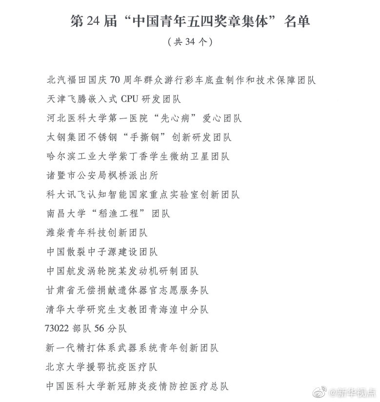 榮獲“中國青年五四獎?wù)录w”的分別是:北汽福田國慶70周年群眾游行彩車底盤制作和技術(shù)保障團(tuán)隊(duì),天津飛騰嵌入式CPU研發(fā)團(tuán)隊(duì),河北醫(yī)科大學(xué)第一醫(yī)院“先心病”愛心團(tuán)隊(duì),太鋼集團(tuán)不銹鋼“手撕鋼”創(chuàng)新研發(fā)團(tuán)隊(duì),哈爾濱工業(yè)大學(xué)紫丁香學(xué)生微納衛(wèi)星團(tuán)隊(duì),諸暨市公安局楓橋派出所,科大訊飛認(rèn)知智能國家重點(diǎn)實(shí)驗(yàn)室創(chuàng)新團(tuán)隊(duì),南昌大學(xué)“稻漁工程”團(tuán)隊(duì),濰柴青年科技創(chuàng)新團(tuán)隊(duì),中國散裂中子源建設(shè)團(tuán)隊(duì),中國航發(fā)渦輪院某發(fā)動機(jī)研制團(tuán)隊(duì),甘肅省無償捐獻(xiàn)遺體器官志愿服務(wù)隊(duì),清華大學(xué)研究生支教團(tuán)青海湟中分隊(duì),73022部隊(duì)56分隊(duì),新一代精打體系武器系統(tǒng)青年創(chuàng)新團(tuán)隊(duì),北京大學(xué)援鄂抗疫醫(yī)療隊(duì),中國醫(yī)科大學(xué)新冠肺炎疫情防控醫(yī)療總隊(duì),吉林大學(xué)第一醫(yī)院重癥救治醫(yī)療隊(duì),南京醫(yī)科大學(xué)第一附屬醫(yī)院(江蘇省人民醫(yī)院)援武漢重癥醫(yī)療隊(duì),浙江大學(xué)醫(yī)學(xué)院附屬第一醫(yī)院新冠肺炎救治青年突擊隊(duì),山東省疾控中心援助黃岡“齊魯青鋒”機(jī)動隊(duì),華中科技大學(xué)同濟(jì)醫(yī)學(xué)院附屬協(xié)和醫(yī)院發(fā)熱門診團(tuán)隊(duì),湖北省第三人民醫(yī)院耳鼻喉科(核酸拭子采樣)團(tuán)隊(duì),湖北卓爾公益基金會,中南大學(xué)湘雅醫(yī)院重癥醫(yī)學(xué)科,四川大學(xué)華西醫(yī)院援鄂青年突擊隊(duì),中部戰(zhàn)區(qū)總醫(yī)院感染科,中日友好醫(yī)院援鄂抗疫醫(yī)療隊(duì),中國建筑三局武漢火神山、雷神山醫(yī)院建設(shè)團(tuán)隊(duì),京東物流武漢亞一城配青年車隊(duì),中國航天科技集團(tuán)有限公司第一研究院二一一廠長征五號運(yùn)載火箭總裝測試團(tuán)隊(duì),中國船舶集團(tuán)有限公司第七〇一研究所首艘國產(chǎn)航母某關(guān)鍵系統(tǒng)系泊航行試驗(yàn)隊(duì),中國航空工業(yè)集團(tuán)有限公司新型戰(zhàn)機(jī)換發(fā)技術(shù)攻關(guān)團(tuán)隊(duì),中國航空發(fā)動機(jī)集團(tuán)有限公司某新型發(fā)動機(jī)研制團(tuán)隊(duì)。