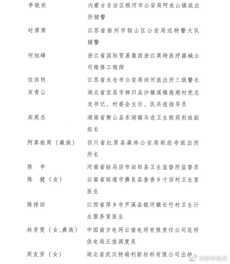 第24屆“中國青年五四獎?wù)隆弊肥谌藛T分別是:廣東省職業(yè)病防治院職業(yè)衛(wèi)生評價(jià)所主管醫(yī)師王爍,陜西省扶風(fēng)恒盛科技生態(tài)農(nóng)業(yè)農(nóng)民專業(yè)合作社員工王輝,黑龍江省齊齊哈爾市公安局鐵鋒分局新工地派出所代理副所長、四級警長王春天,湖南省邵東市公安局水東江鎮(zhèn)派出所輔警王調(diào)兵,江蘇省蘇州阿美咔嘰文化傳播有限公司總經(jīng)理、蘇州藍(lán)天救援隊(duì)隊(duì)員兼江蘇機(jī)動隊(duì)隊(duì)長許鵬,山東省泰安市公安局泰山分局網(wǎng)絡(luò)安全保衛(wèi)大隊(duì)偵查中隊(duì)指導(dǎo)員李弦,湖北省武漢市中心醫(yī)院眼科主治醫(yī)師李文亮(滿族),云南省南澗縣樂秋鄉(xiāng)國土和村鎮(zhèn)規(guī)劃建設(shè)服務(wù)中心職員李光劍(彝族),山東省德州市陵城區(qū)徽王莊鎮(zhèn)徽王管區(qū)書記李洪明,內(nèi)蒙古自治區(qū)根河市公安局阿龍山鎮(zhèn)派出所輔警李曉歡,江蘇省徐州市銅山區(qū)公安局巡特警大隊(duì)輔警時(shí)席席,浙江省國際貿(mào)易集團(tuán)浙江英特醫(yī)療器械公司維修工程師何旭峰,江蘇省太倉市公安局瀏河派出所三級警長位洪明,湖北省宜昌市秭歸縣沙鎮(zhèn)溪鎮(zhèn)高潮村黨總支書記、村委會主任、民兵連指導(dǎo)員宋青山,湖南省衡山縣東湖鎮(zhèn)馬跡衛(wèi)生院藥劑組副組長宋英杰,四川省紅原縣森林公安局刷經(jīng)寺派出所所長阿真能周(藏族),河南省駐馬店市泌陽縣衛(wèi)生監(jiān)督所監(jiān)督員陳申,云南省昭通市彝良縣奎香鄉(xiāng)寸田村衛(wèi)生室醫(yī)生陳健(女),江西省萍鄉(xiāng)市蘆溪縣銀河鎮(zhèn)長竹村衛(wèi)生計(jì)生服務(wù)室醫(yī)生陳祥田,中國南方電網(wǎng)云南電網(wǎng)有限責(zé)任公司昆明供電局正值調(diào)度員林芳雯(女、彝族),湖北省武漢特瑞利新材料有限公司出納周友芳(女),安徽省銅陵市樅陽縣公安局特(巡)警大隊(duì)輔警一中隊(duì)副隊(duì)長胡鋒,四川省甘孜藏族自治州得榮縣龍絨寺寺廟管理委員會主任洛絨益西(藏族),四川省廣元經(jīng)開區(qū)盤龍鎮(zhèn)深溝村村民宮高明,江蘇省南京市公安局高淳分局淳溪派出所輔警袁劍雄,山東省泰安市岱岳區(qū)角峪鎮(zhèn)先鋒村村民賈慶臣,湖北省武漢市蔡甸區(qū)人民醫(yī)院住院醫(yī)師夏思思(女),江蘇省南京市公安局行政審批服務(wù)處網(wǎng)絡(luò)政務(wù)科一級警員徐昊,江蘇省徐州市沛縣公安局五段派出所輔警章良志,湖北省武漢市江夏區(qū)第一人民醫(yī)院醫(yī)師彭銀華,廣東省英德市公安局橋頭派出所輔警曾文聰,江西省蓮花縣湖上鄉(xiāng)中心衛(wèi)生院醫(yī)生熊波,河南省鄭州市公安局東風(fēng)路分局治安管理服務(wù)大隊(duì)三中隊(duì)民警、四級警長樊樹鋒,甘肅省舟曲縣扶貧辦副主任張小娟(女、藏族)。