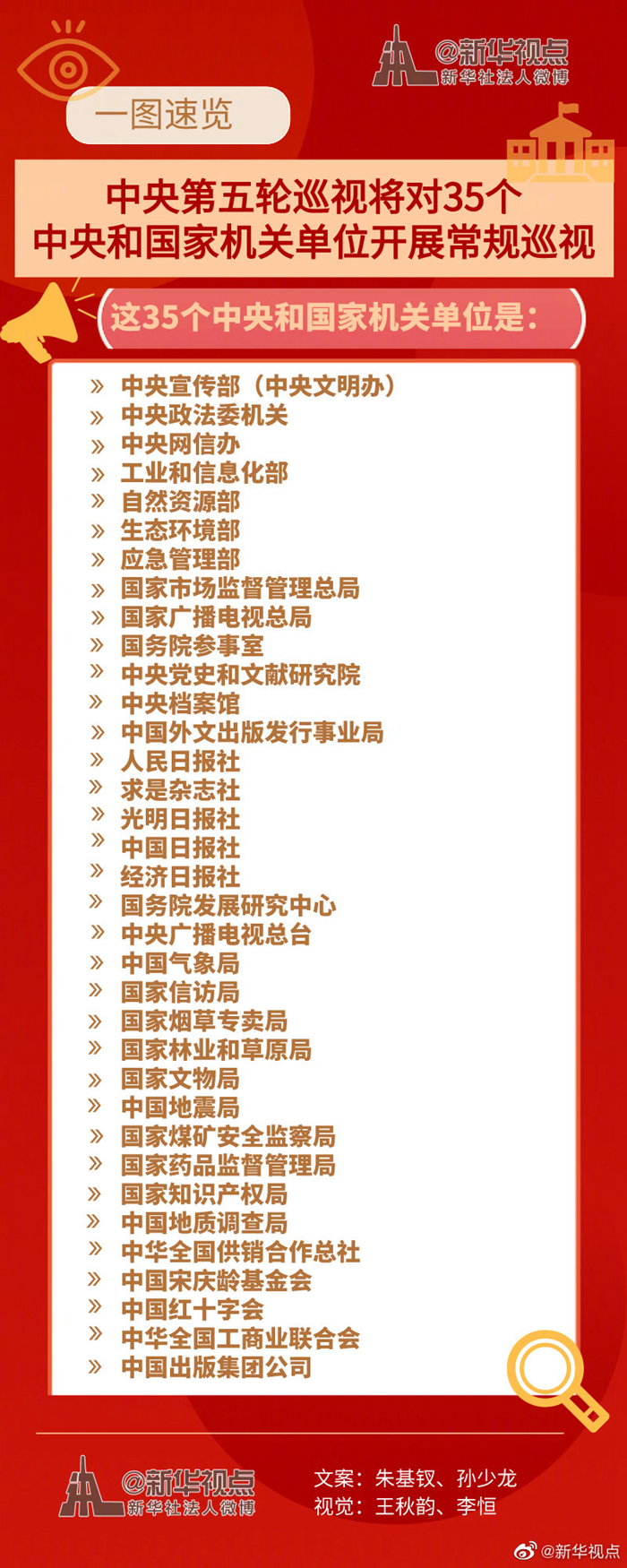 新華社北京5月9日電 經(jīng)黨中央批準(zhǔn),十九屆中央第五輪巡視將對中央宣傳部(中央文明辦)、中央政法委機(jī)關(guān)、中央網(wǎng)信辦、工業(yè)和信息化部、自然資源部、生態(tài)環(huán)境部、應(yīng)急管理部、國家市場監(jiān)督管理總局、國家廣播電視總局、國務(wù)院參事室、中央黨史和文獻(xiàn)研究院、中央檔案館、中國外文出版發(fā)行事業(yè)局、人民日報(bào)社、求是雜志社、光明日報(bào)社、中國日報(bào)社、經(jīng)濟(jì)日報(bào)社、國務(wù)院發(fā)展研究中心、中央廣播電視總臺(tái)、中國氣象局、國家信訪局、國家煙草專賣局、國家林業(yè)和草原局、國家文物局、中國地震局、國家煤礦安全監(jiān)察局、國家藥品監(jiān)督管理局、國家知識(shí)產(chǎn)權(quán)局、中國地質(zhì)調(diào)查局、中華全國供銷合作總社、中國宋慶齡基金會(huì)、中國紅十字會(huì)、中華全國工商業(yè)聯(lián)合會(huì)、中國出版集團(tuán)公司等35個(gè)中央和國家機(jī)關(guān)單位黨組織開展常規(guī)巡視。