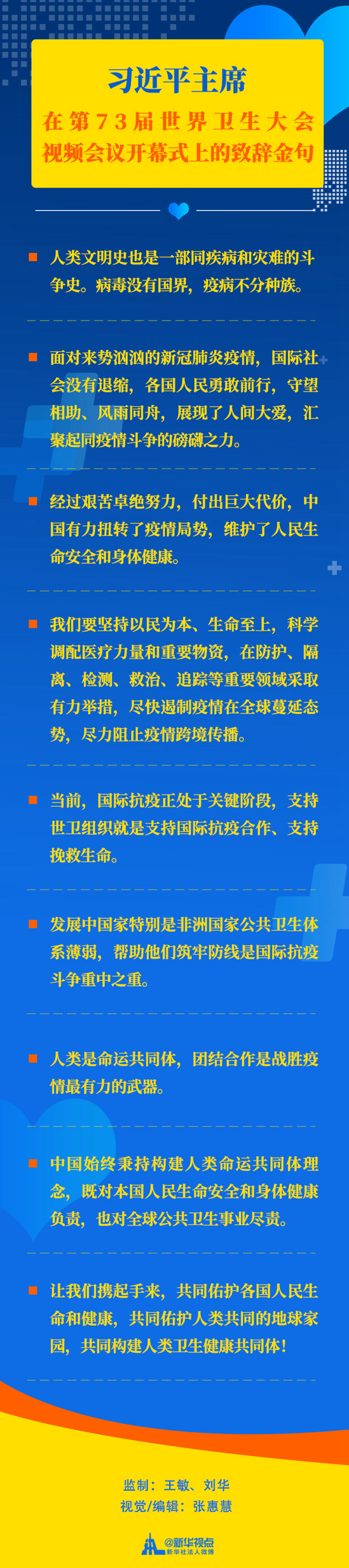 習(xí)近平主席在第73屆世界衛(wèi)生大會(huì)視頻會(huì)議開(kāi)幕式上的致辭金句