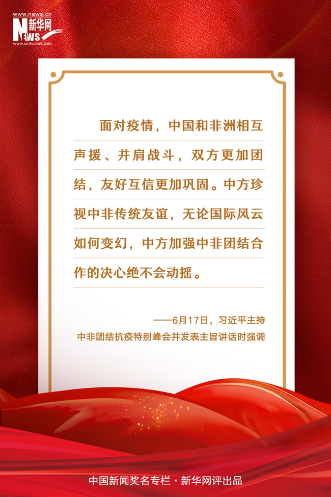 新老朋友通過(guò)視頻相聚,共商團(tuán)結(jié)抗疫大計(jì),共敘中非兄弟情誼。6月17日,由中國(guó)和非洲聯(lián)盟輪值主席國(guó)南非、中非合作論壇共同主席國(guó)塞內(nèi)加爾共同發(fā)起的中非團(tuán)結(jié)抗疫特別峰會(huì)舉行。國(guó)家主席習(xí)近平在北京主持了這一峰會(huì),并發(fā)表題為《團(tuán)結(jié)抗疫 共克時(shí)艱》的主旨講話,強(qiáng)調(diào)中非要堅(jiān)定不移攜手抗擊疫情、推進(jìn)中非合作、踐行多邊主義、推進(jìn)中非友好,共同打造中非衛(wèi)生健康共同體,推進(jìn)中非全面戰(zhàn)略合作伙伴關(guān)系高水平發(fā)展。