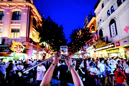 一位游客手機拍攝夜色中的中央大街(資料片)。本報記者王建威攝