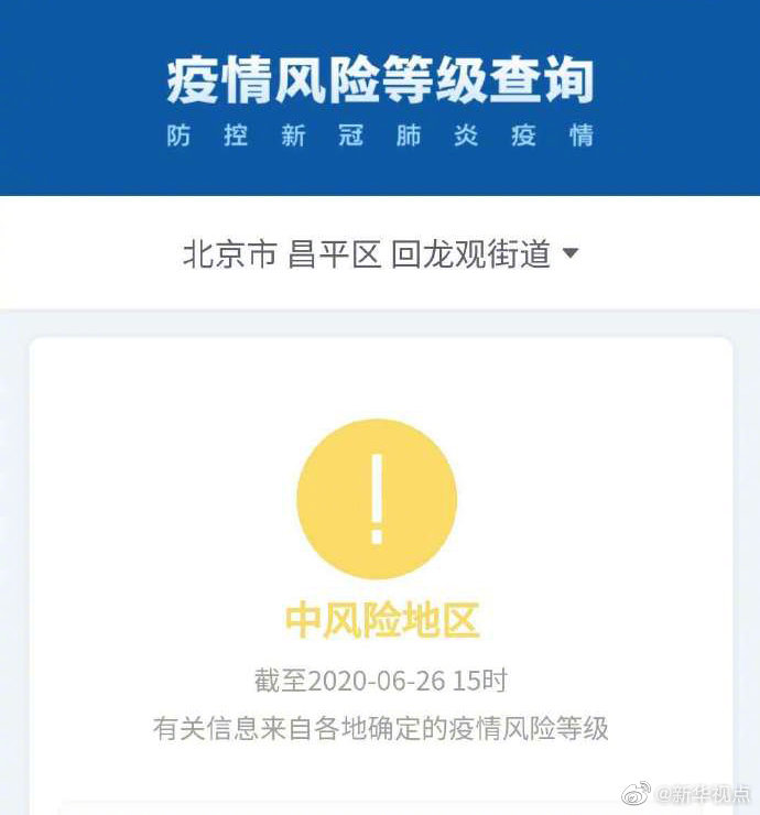 根據國務院客戶端小程序“疫情風險等級查詢”,截至6月26日15時,北京市西城區(qū)月壇街道由中風險地區(qū)變更為低風險地區(qū)。海淀區(qū)四季青(地區(qū))鎮(zhèn)、昌平區(qū)回龍觀街道升級為中風險地區(qū)。