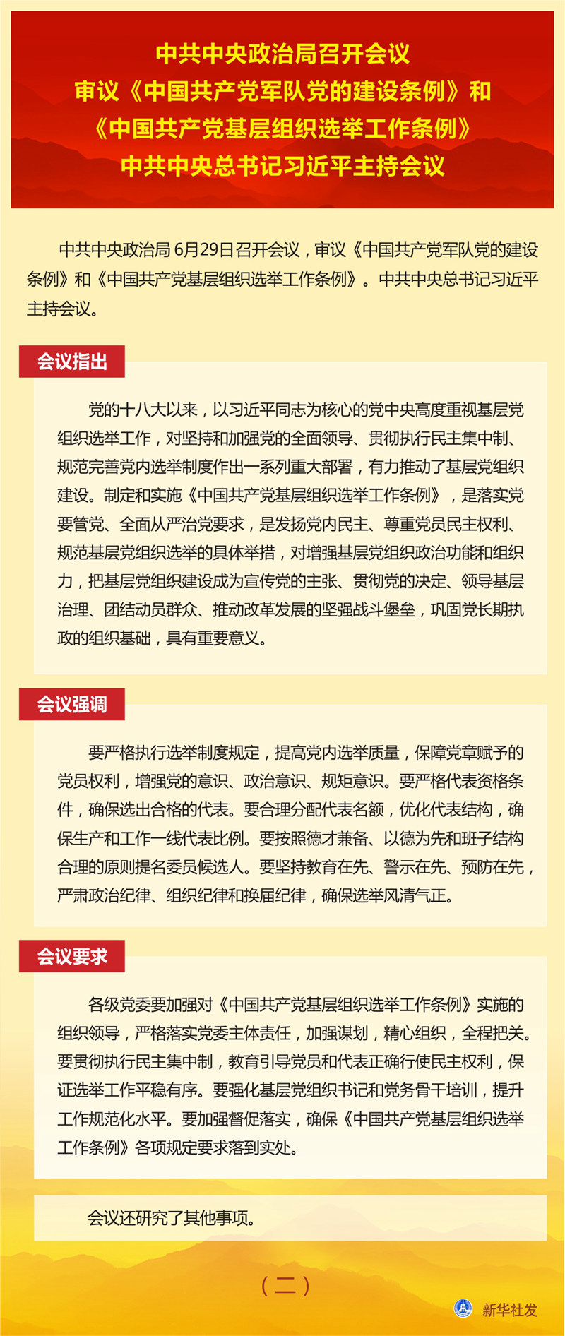 中共中央政治局召開(kāi)會(huì)議 審議《中國(guó)共產(chǎn)黨軍隊(duì)黨的建設(shè)條例》和《中國(guó)共產(chǎn)黨基層組織選舉工作條例》 習(xí)近平主持會(huì)議