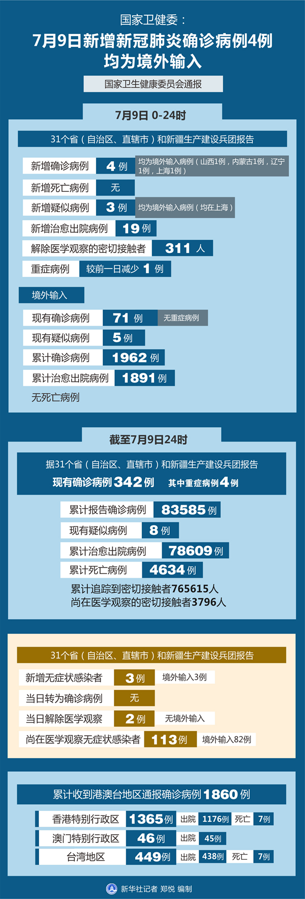 截至7月9日24時(shí),據(jù)31個(gè)?。ㄗ灾螀^(qū)、直轄市)和新疆生產(chǎn)建設(shè)兵團(tuán)報(bào)告,現(xiàn)有確診病例342例(其中重癥病例4例),累計(jì)治愈出院病例78609例,累計(jì)死亡病例4634例,累計(jì)報(bào)告確診病例83585例,現(xiàn)有疑似病例8例。累計(jì)追蹤到密切接觸者765615人,尚在醫(yī)學(xué)觀察的密切接觸者3796人。