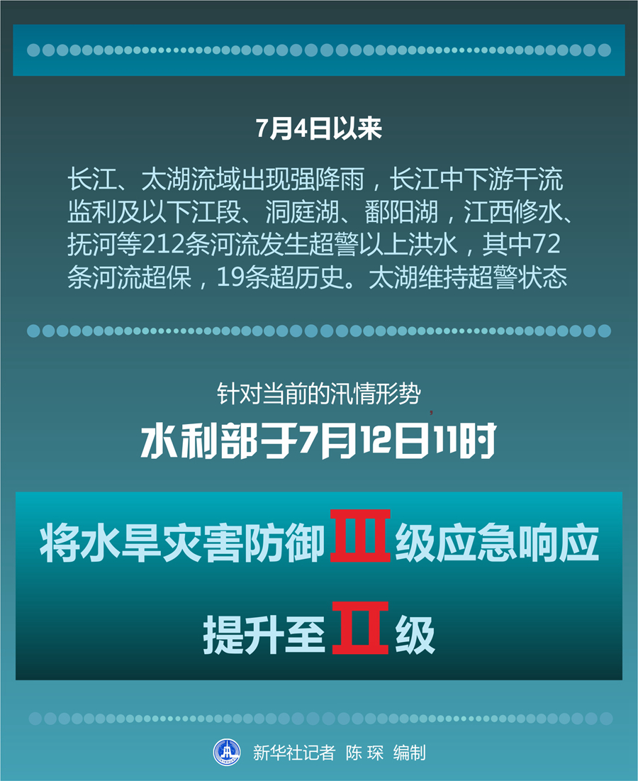 新華社北京7月12日電(記者胡璐)7月4日以來,長江、太湖流域出現(xiàn)強降雨,長江中下游干流監(jiān)利及以下江段、洞庭湖、鄱陽湖,江西修水、撫河等212條河流發(fā)生超警以上洪水,其中72條河流超保,19條超歷史。太湖維持超警狀態(tài)。針對當前的汛情形勢,水利部于12日11時將水旱災害防御Ⅲ級應急響應提升至Ⅱ級。