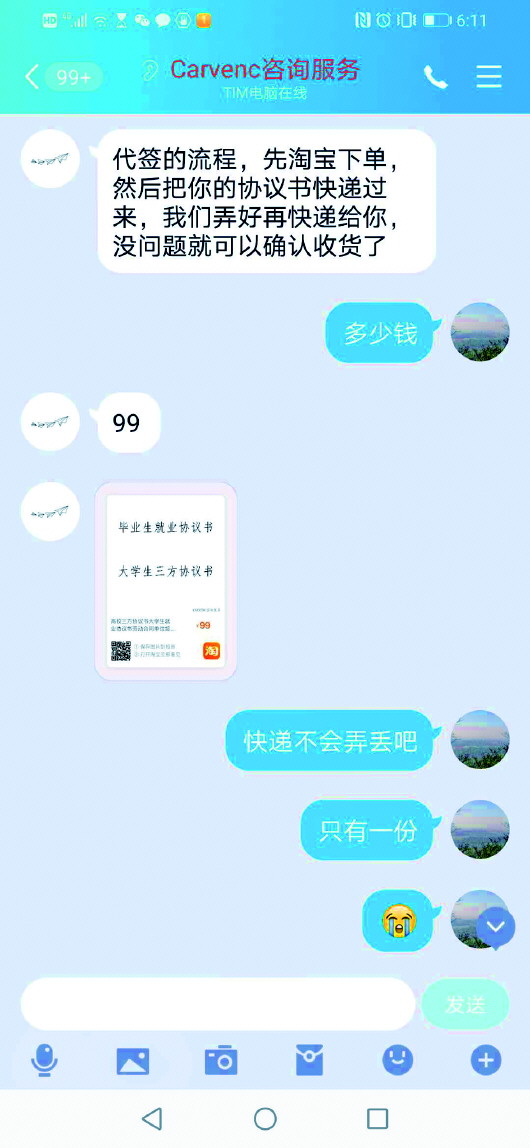 淘寶網(wǎng)上有多家能代簽三方協(xié)議的商家。在看到記者“能否代蓋三方協(xié)議公章”的留言后,一家名為“carvenc education”的商家立即追問所在學(xué)校、專業(yè)。記者提供相關(guān)信息后,不到一分鐘,商家就發(fā)來相匹配的公司名稱和崗位,“只要99元,協(xié)議書真實有效,包回訪。”