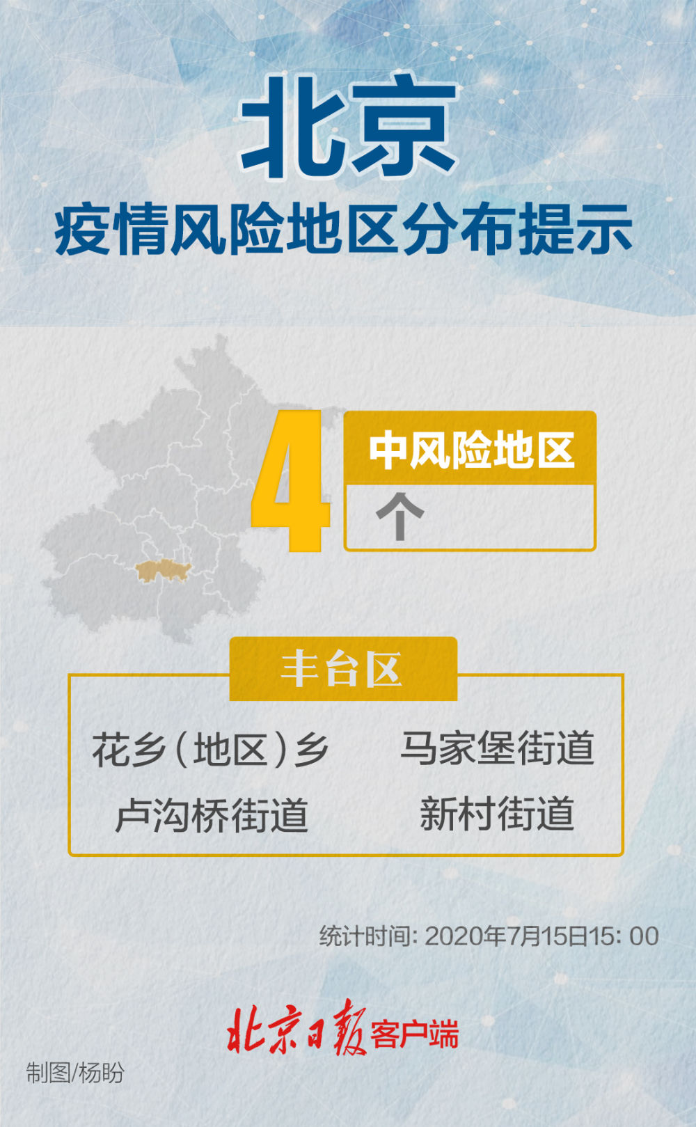 今天下午,在北京市新型冠狀病毒肺炎疫情防控工作第152場新聞發(fā)布會上,市疾控中心副主任龐星火介紹,7月14日0時至24時,北京無新增報告確診病例。經(jīng)評估,大興區(qū)青云店鎮(zhèn)、西紅門鎮(zhèn)、興豐街道連續(xù)14天內(nèi)無新增本地確診病例,由中風(fēng)險地區(qū)調(diào)整為低風(fēng)險地區(qū)。截至目前,北京市共有中風(fēng)險地區(qū)4個,為豐臺區(qū)花鄉(xiāng)鄉(xiāng)、盧溝橋街道、馬家堡街道、新村街道。豐臺區(qū)其余街道為低風(fēng)險地區(qū)。
