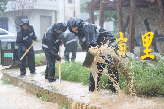 2020年7月6日,浙江省湖州市德清縣武康街道對(duì)河口村,青年黨員搶險(xiǎn)救援隊(duì)隊(duì)員正在用鐵鍬排水。人民圖片 王正/攝