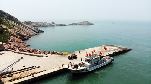 7月16日,“擁軍船”在蘇山島停靠(無(wú)人機(jī)照片)。新華社記者 王凱 攝