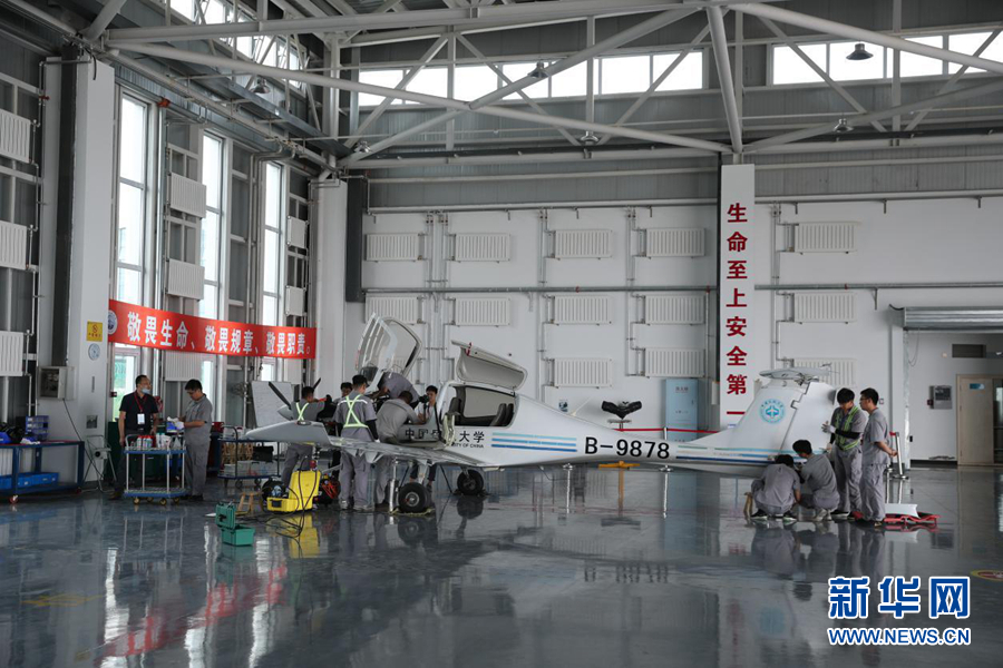 圖為機務人員在檢修飛行達到1000小時的訓練機。新華網(wǎng)記者焦鵬 攝