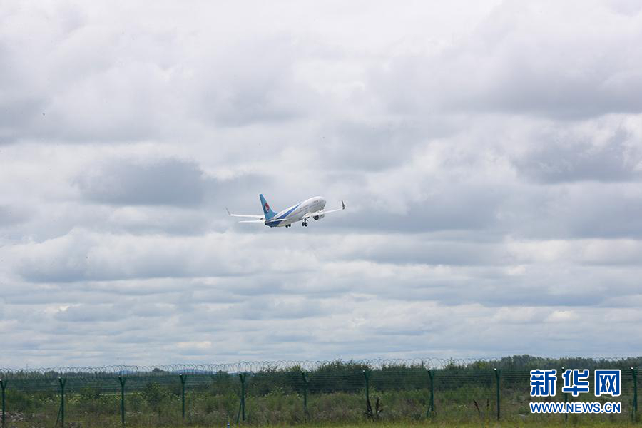 圖為8月6日在扎蘭屯成吉思汗機場起飛的河北航空公司波音737-800客機。新華網(wǎng)記者焦鵬 攝