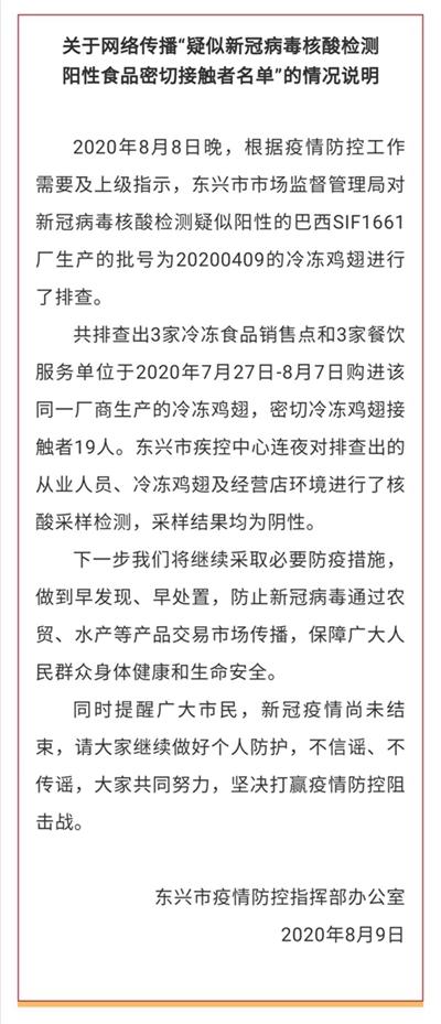 8月9日,記者從東興市疫情防控指揮部辦公室了解到, 8月8日晚,根據(jù)疫情防控工作需要及上級(jí)指示,東興市市場監(jiān)督管理局對(duì)新冠病毒核酸檢測疑似陽性的巴西SIF1661廠生產(chǎn)的批號(hào)為20200409的冷凍雞翅進(jìn)行了排查,共排查出3家冷凍食品銷售點(diǎn)和3家餐飲服務(wù)單位于2020年7月27日—8月7日購進(jìn)該同一廠商生產(chǎn)的冷凍雞翅,密切冷凍雞翅接觸者19人。東興市疾控中心連夜對(duì)排查出的從業(yè)人員、冷凍雞翅及經(jīng)營店環(huán)境進(jìn)行了核酸采樣檢測,采樣結(jié)果均為陰性。