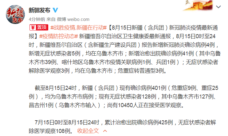 截至8月15日24時(shí),新疆(含兵團(tuán))現(xiàn)有確診病例401例(危重癥9例、重癥25例),均為烏魯木齊市病例;現(xiàn)有無癥狀感染者128例,其中烏魯木齊市127例、昌吉州1例(烏魯木齊市輸入);尚有10450人正在接受醫(yī)學(xué)觀察。