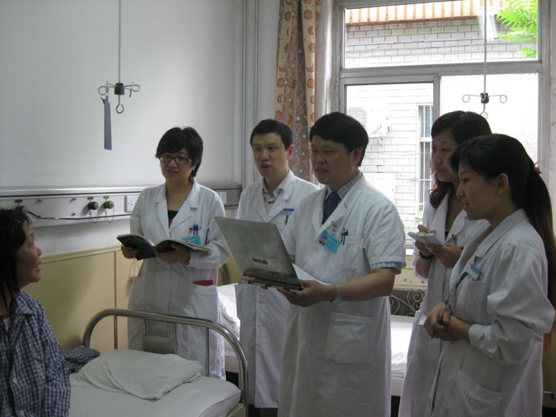中國醫(yī)學(xué)科學(xué)院腫瘤醫(yī)院徐兵河教授(右三)、馬飛教授(右四)攜治療團(tuán)隊(duì)在病房查問乳腺癌患者康復(fù)情況。圖片由受訪者提供