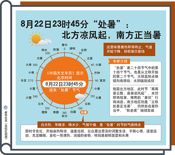 圖表:8月22日23時(shí)45分“處暑”:北方?jīng)鲲L(fēng)起,南方正當(dāng)暑 新華社發(fā) 邊紀(jì)紅 制圖