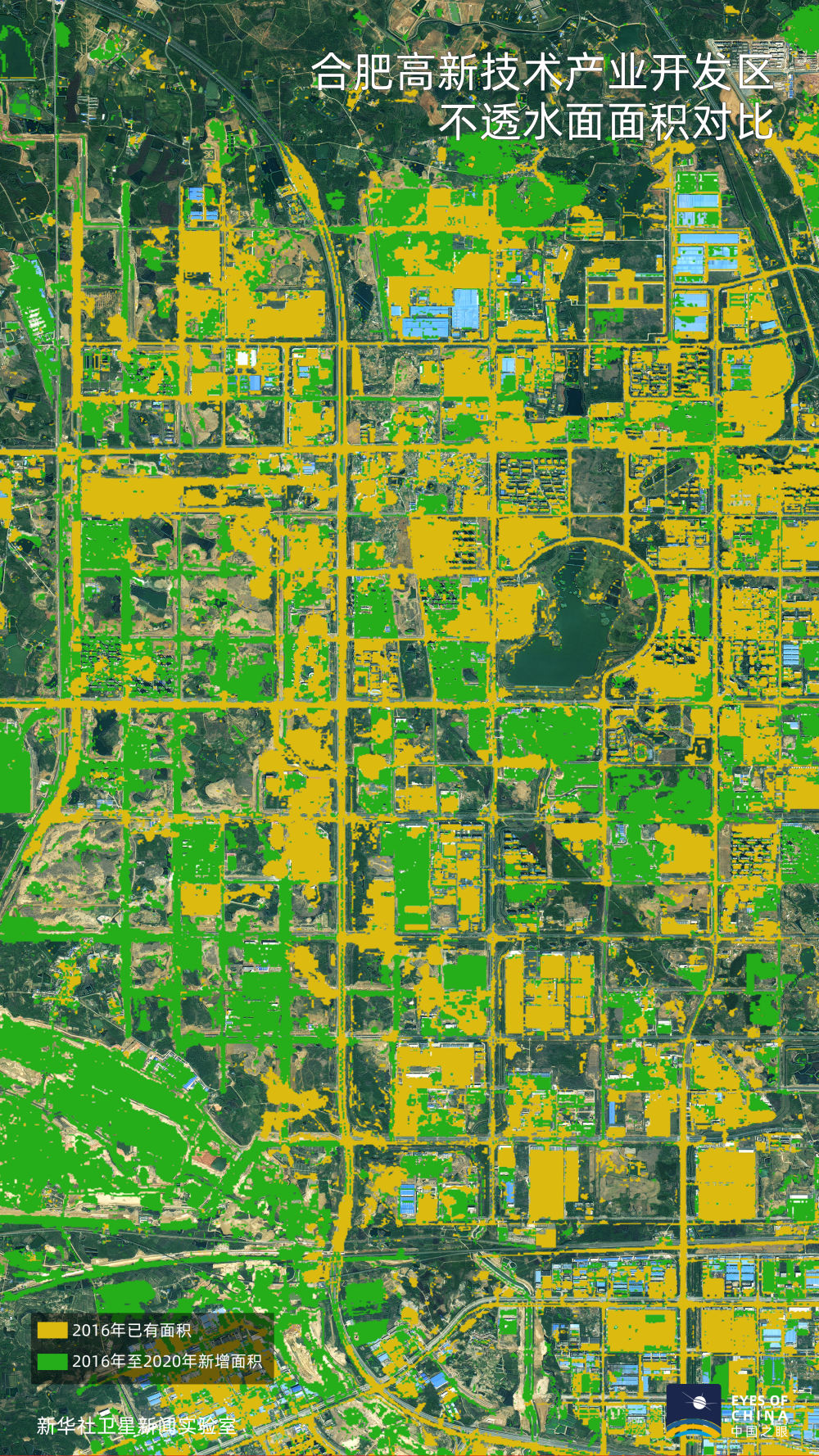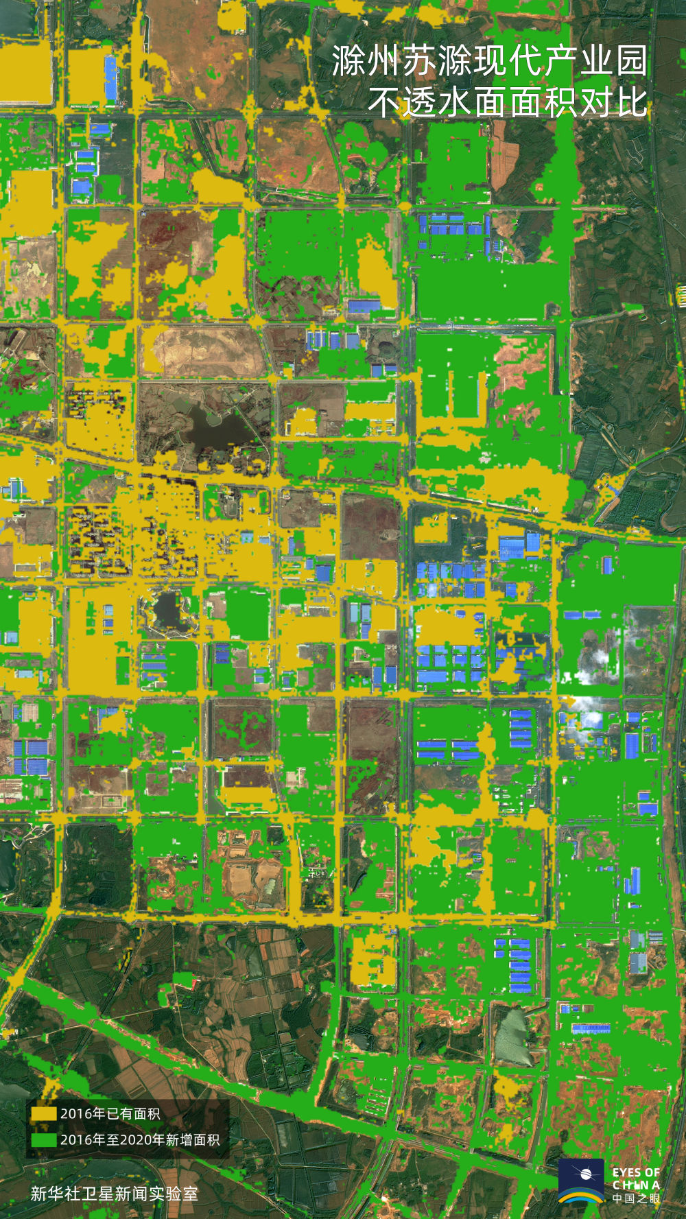 黃色覆蓋區(qū)域?yàn)?016年已有不透水面區(qū)域,綠色為2020年較2016年新增區(qū)域。大幅增加的綠色顯示,滁州和合肥的工業(yè)園區(qū)范圍在快速向外延伸,經(jīng)濟(jì)發(fā)展邁上新臺(tái)階。