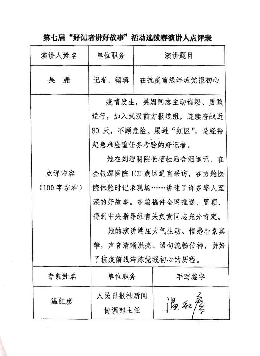 溫紅彥點評吳姍《在抗疫前線淬煉黨報初心》