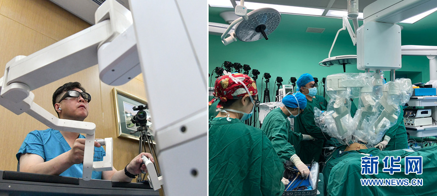 左圖:9月24日,在青島大學(xué)附屬醫(yī)院,醫(yī)院副院長、教授牛海濤使用新一代國產(chǎn)原研手術(shù)機器人——“妙手”為貴州省安順市的患者實施超遠程手術(shù)。新華社記者 李賀 攝