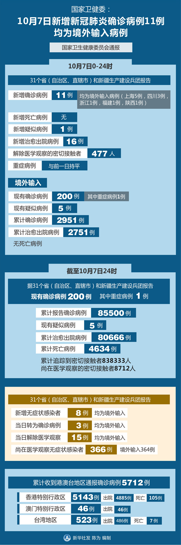 截至10月7日24時(shí),據(jù)31個(gè)?。ㄗ灾螀^(qū)、直轄市)和新疆生產(chǎn)建設(shè)兵團(tuán)報(bào)告,現(xiàn)有確診病例200例(其中重癥病例1例),累計(jì)治愈出院病例80666例,累計(jì)死亡病例4634例,累計(jì)報(bào)告確診病例85500例,現(xiàn)有疑似病例5例。累計(jì)追蹤到密切接觸者838333人,尚在醫(yī)學(xué)觀察的密切接觸者8712人。