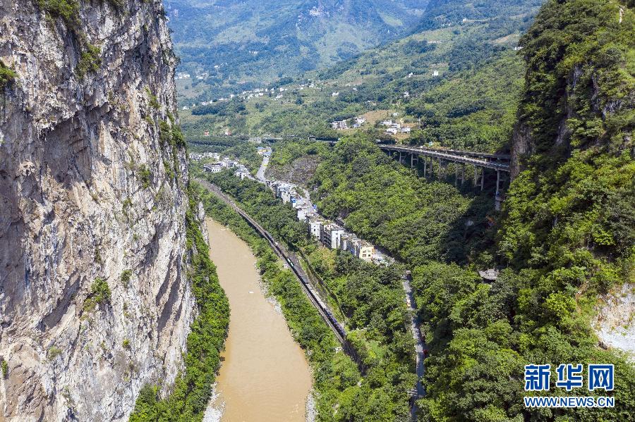 在云南省昭通市鹽津縣豆沙關(guān),五尺道、關(guān)河水道、內(nèi)昆鐵路、G247公路及G85渝昆高速5條不同時期的交通線路以幾乎并行的姿態(tài)呈現(xiàn)眼前(8月10日攝,無人機(jī)照片)。 新華社記者 江文耀 攝