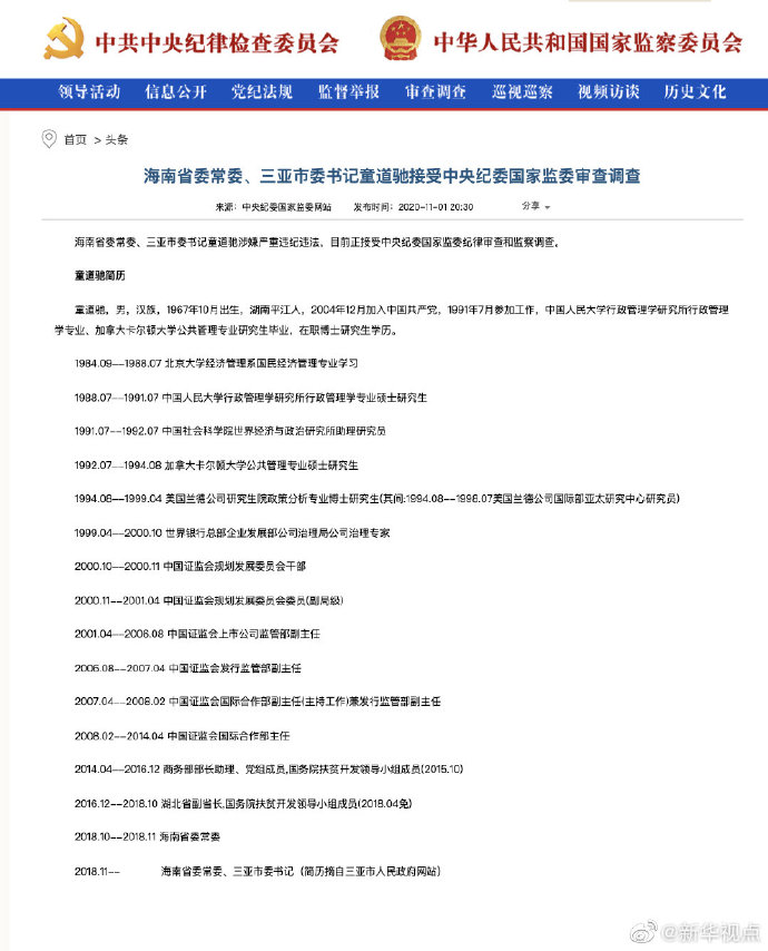 海南省委常委、三亞市委書記童道馳接受中央紀委國家監(jiān)委審查調(diào)查
