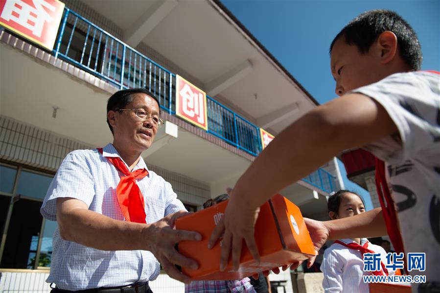 北京市西城區(qū)陶然亭小學(xué)退休老校長劉建文(左)在他支教的河北省阜平縣半溝小學(xué)開學(xué)典禮上給學(xué)生贈(zèng)送學(xué)習(xí)用品(9月3日攝)。新華社記者 陳鐘昊 攝
