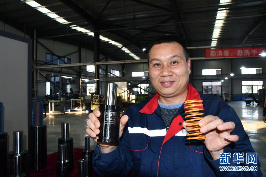 在四川省廣安市鄰水縣川渝合作高灘園區(qū),四川欣悅精工科技有限公司管理部經理劉世華展示公司研發(fā)生產的新型彈簧和傳統(tǒng)螺旋彈簧(11月12日攝)。新華社記者 周相吉 攝