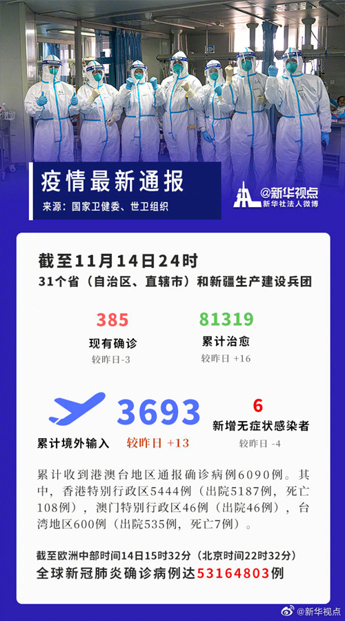 截至11月14日24時(shí),據(jù)31個(gè)?。ㄗ灾螀^(qū)、直轄市)和新疆生產(chǎn)建設(shè)兵團(tuán)報(bào)告,現(xiàn)有確診病例385例(其中重癥病例4例),累計(jì)治愈出院病例81319例,累計(jì)死亡病例4634例,累計(jì)報(bào)告確診病例86338例,現(xiàn)有疑似病例2例。累計(jì)追蹤到密切接觸者873191人,尚在醫(yī)學(xué)觀察的密切接觸者15032人。