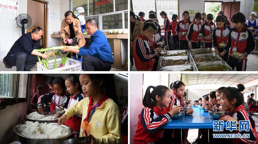 這是一張拼版照片。上左:在融水苗族自治縣東陽村小學(xué),廚房師傅們在準(zhǔn)備營養(yǎng)午餐;上右:東陽村小學(xué)學(xué)生根據(jù)需要挑選菜肴。下左:東陽村小學(xué)學(xué)生排隊打飯;下右:東陽村小學(xué)學(xué)生在食用營養(yǎng)午餐。近年來,廣西在貧困地區(qū)大力推行學(xué)生營養(yǎng)餐,幫助貧困學(xué)生健康成長(2019年5月6日攝)。新華社記者 張愛林 攝