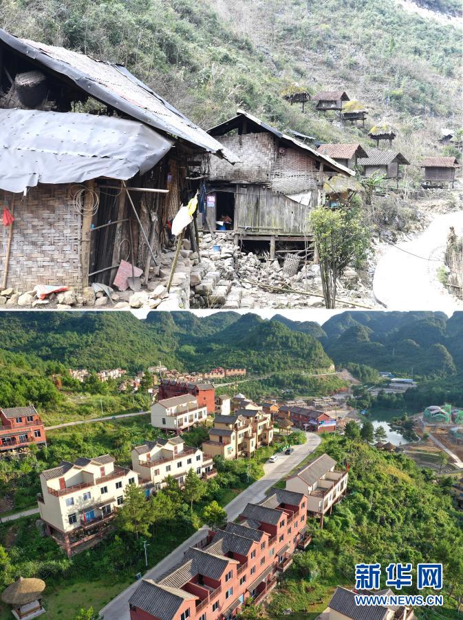 這是一張拼版照片。上圖:整屯搬遷前的廣西南丹縣里湖瑤族鄉(xiāng)董甲村么干屯(2018年1月10日攝)。這里的村民都搬遷到“千家瑤寨·萬戶瑤鄉(xiāng)”里湖王尚易地扶貧搬遷安置點。下圖:“千家瑤寨·萬戶瑤鄉(xiāng)”里湖王尚易地扶貧搬遷安置點(8月4日攝,無人機照片)。新華社記者 周華 攝