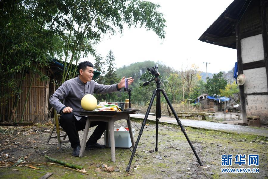 梁平七星鎮(zhèn)小伙曾慶貴通過網(wǎng)絡直播推銷家鄉(xiāng)特色農(nóng)產(chǎn)品(11月18日攝)。新華社記者 唐奕 攝