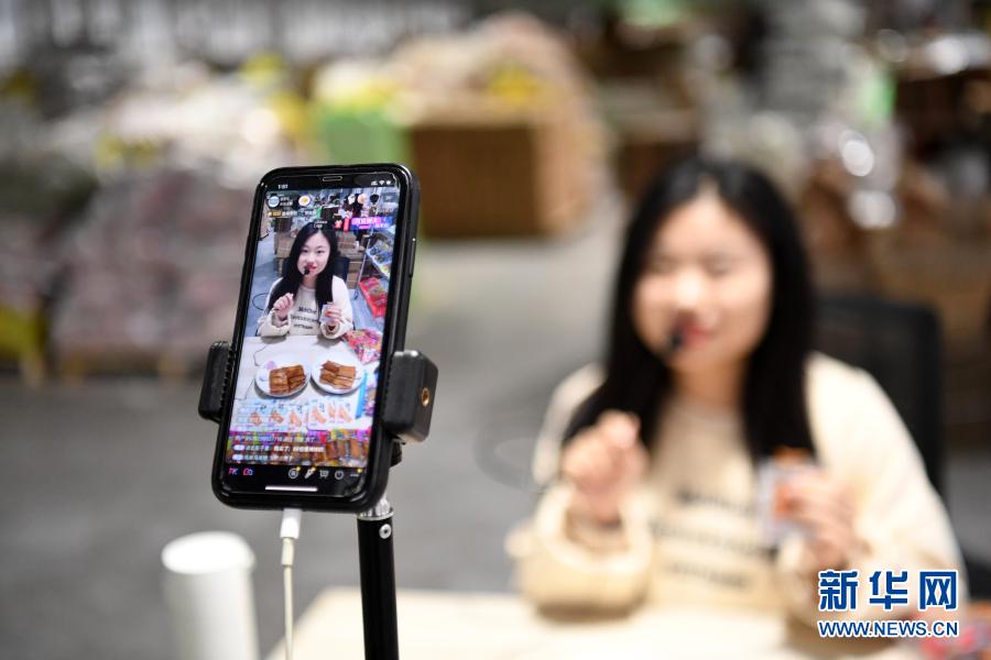 網(wǎng)絡主播在梁平一家工廠內(nèi)直播推銷傳統(tǒng)豆干(11月18日攝)。新華社記者 唐奕 攝